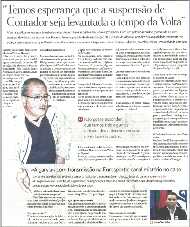 Sem dúvida uma óptima notícia para todos os algarvios e também para os amantes da modalidade. Lamenta-se o estado a que a modalidade chegou no nosso país mas também no mundo, fruto da crise económica, e dos casos de doping que têm ensombrado o Ciclismo, mas também outras modalidades onde o esforço físico é decisivo para poder ter sucesso...