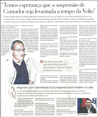 Quando Rogério Teixeira, lamenta e desespera pela presença de Alberto Contador na "Algarvia", pergunto-me se isto não é mais que a evidência da necessidade em manter e quiçá rentabilizar o evento em termos mediáticos, em contradição com a necessidade de uma vez por todas se assumir a credibilização do Ciclismo, custe a quem custar, nem que para isso seja preciso estabelecer metas menos ambiciosas.
